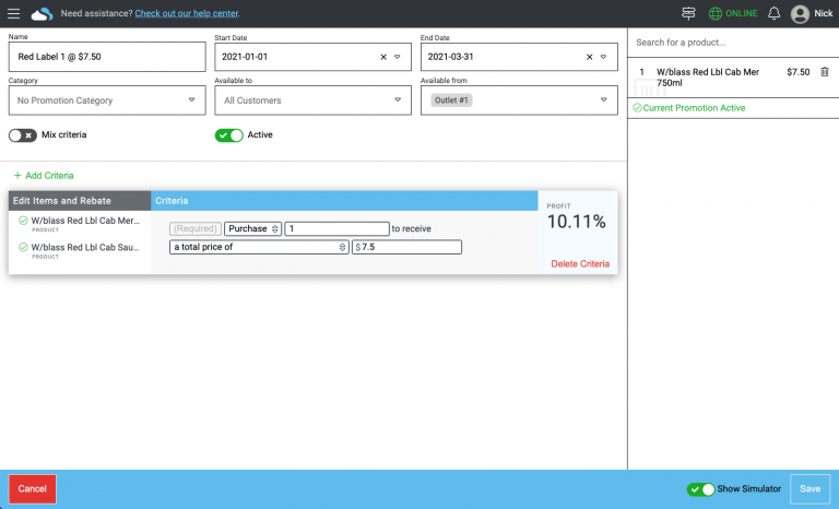 Want to test out a promotion before it has started or need to test it out on a non-register? Now you can with the promotion simulator. Simply edit a promotion, enable the promotion simulator in the bottom right-hand corner and add the products you want to test.