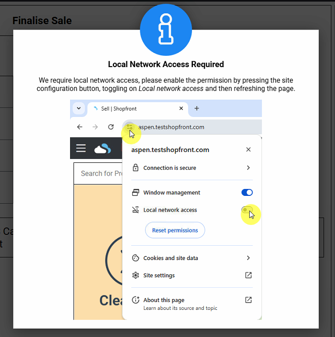As part of a recent Google Chrome update, any website that now requires access to your local computer requires a new user-provided permission called Local Network Access. Shopfront uses this to communicate with our hardware application (Hardware Connect) which controls things like your cash register and also for some external applications (like Linkly).